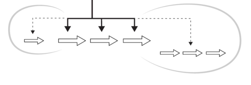 An organization’s boundaries begin to blur when it engages in outsourcing—the opposite of vertically integrating—as some activities previously done in-house are contracted to outside organizations, or individuals (shown in Figure 3).Many companies these days, for example, engage specialized consulting firms to search for new executives.The suppliers of these services are not in the organization, but not quite out of it either: they may, for example, supply it on a regular basis, under contract. In one factory I visited, the workers in blue were employees of the company whereas those in green, doing the similar work, received their paycheques from another company. The boundaries in this factory were evident only in the colors of the work clothes!